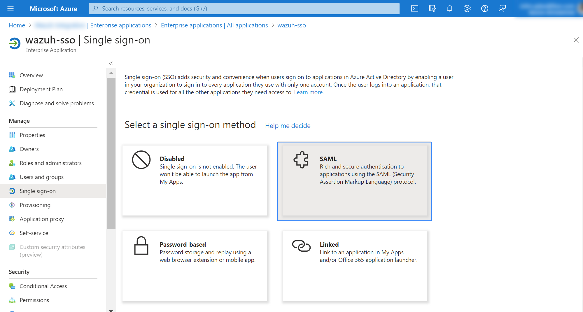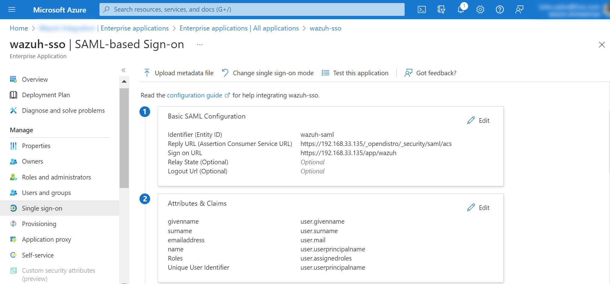 Note the necessary parameters. In the Enterprise applications menu, select your application and then click on Single sign-on. Note some parameters that will be used in the Wazuh indexer configuration.