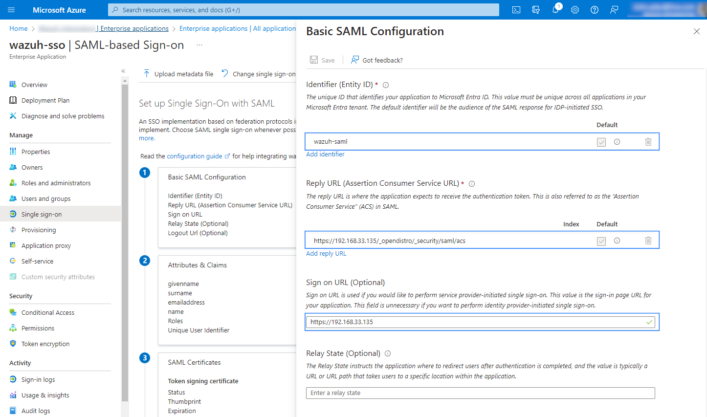 idp.metadata_urlin the Wazuh indexer configuration file.In option 4 Set up <YOUR APPLICATION>, the Microsoft Entra ID Identifier will be our