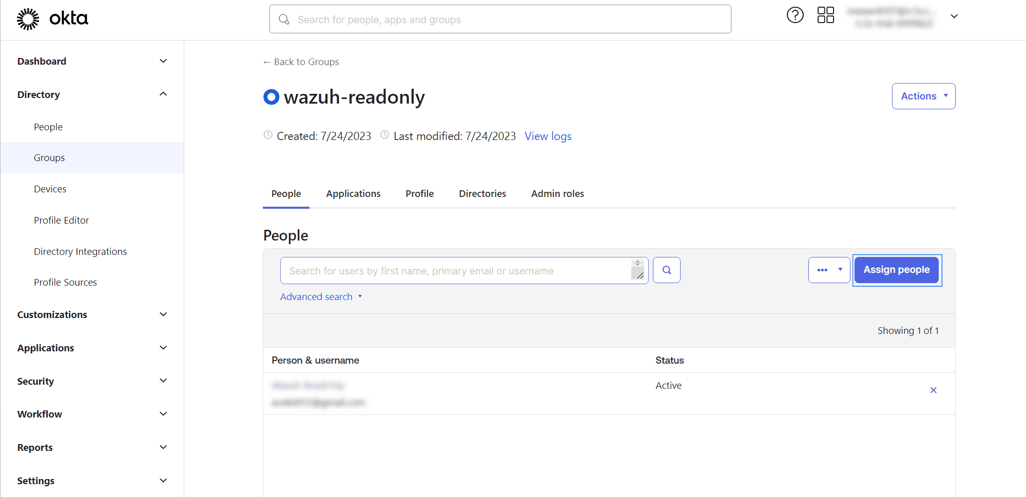 wazuh-readonly. This name will be used as ourbackend_rolesinroles_mapping.yml.Add the new user to the new group. Navigate to Directory > Groups and select your group. Click on Assign People and add the user to the group created.