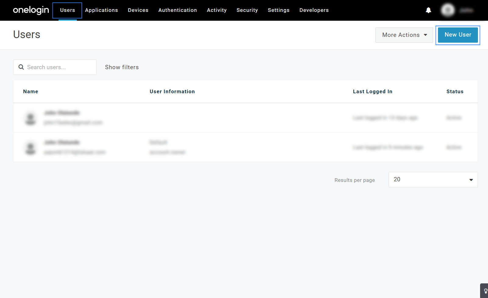 Log in to OneLogin web console, and select Administration > Users > New User.