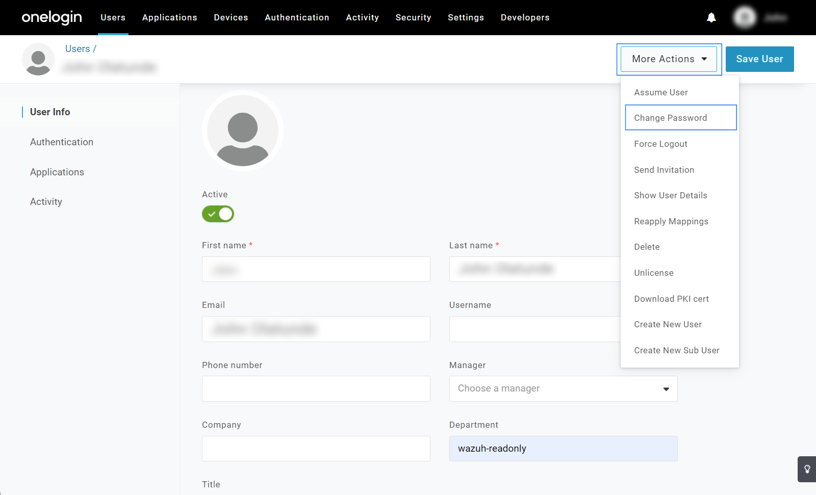 Complete the mandatory fields, assign a value in the Department field and click on Save User. In our case, the department is