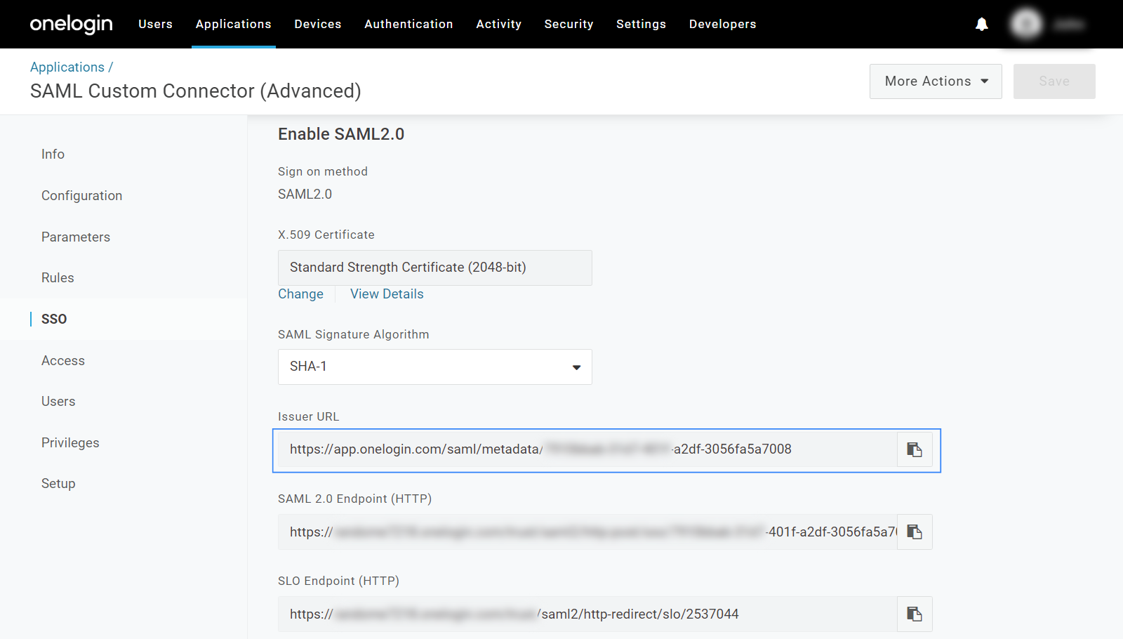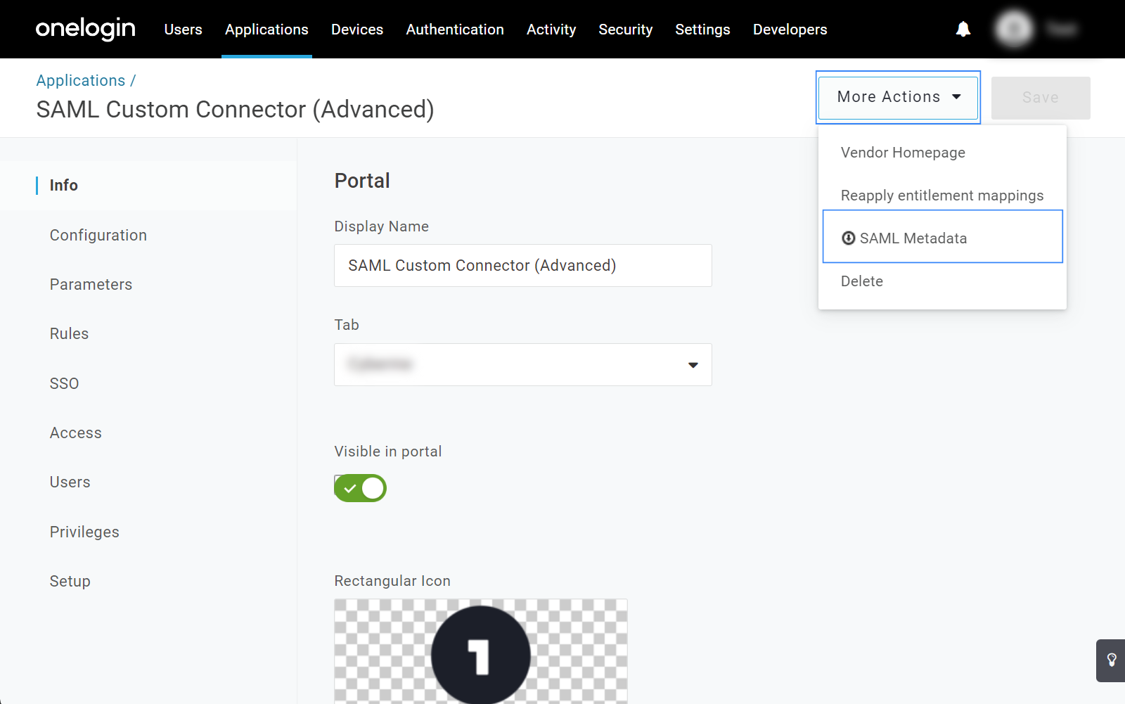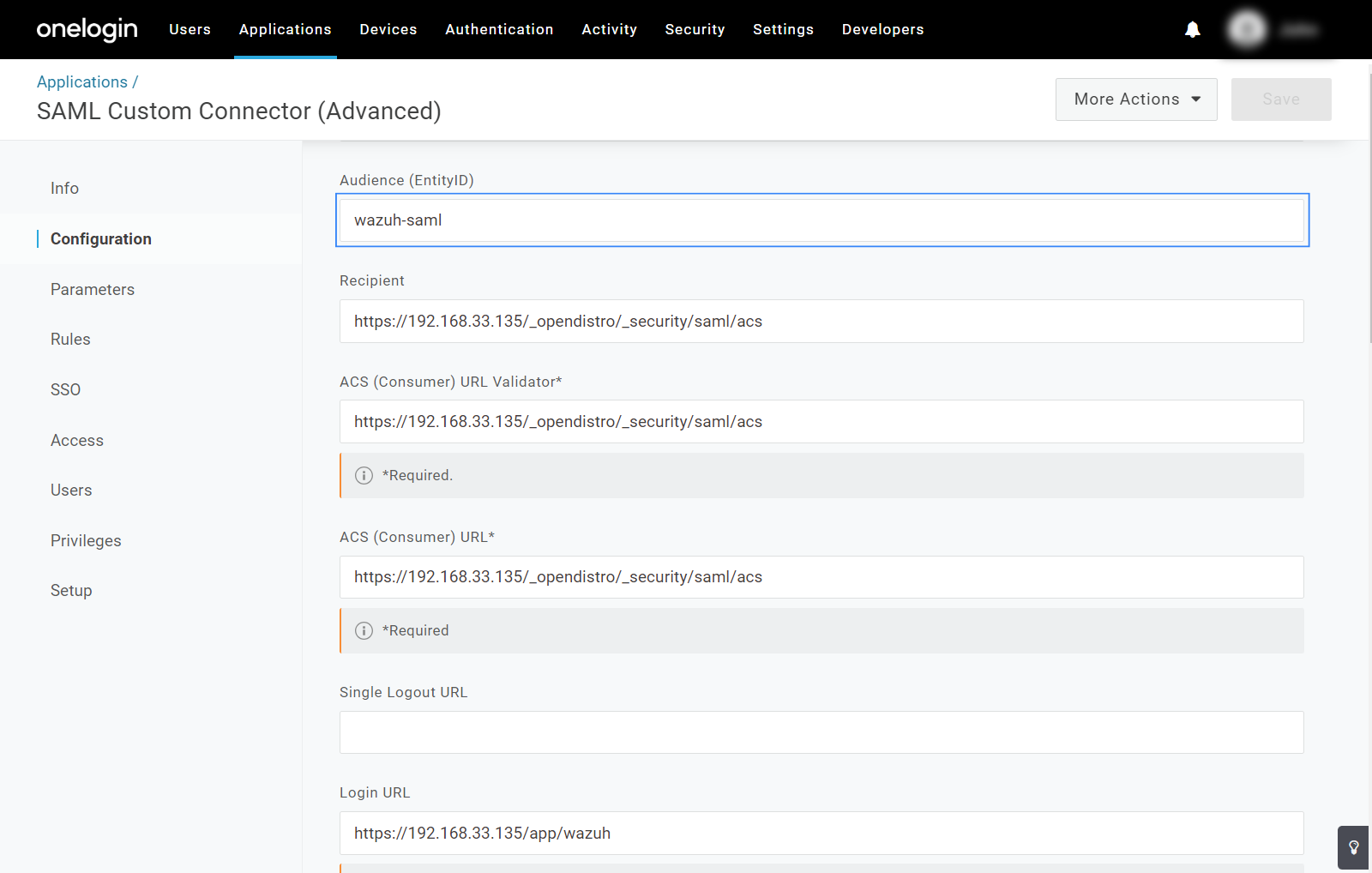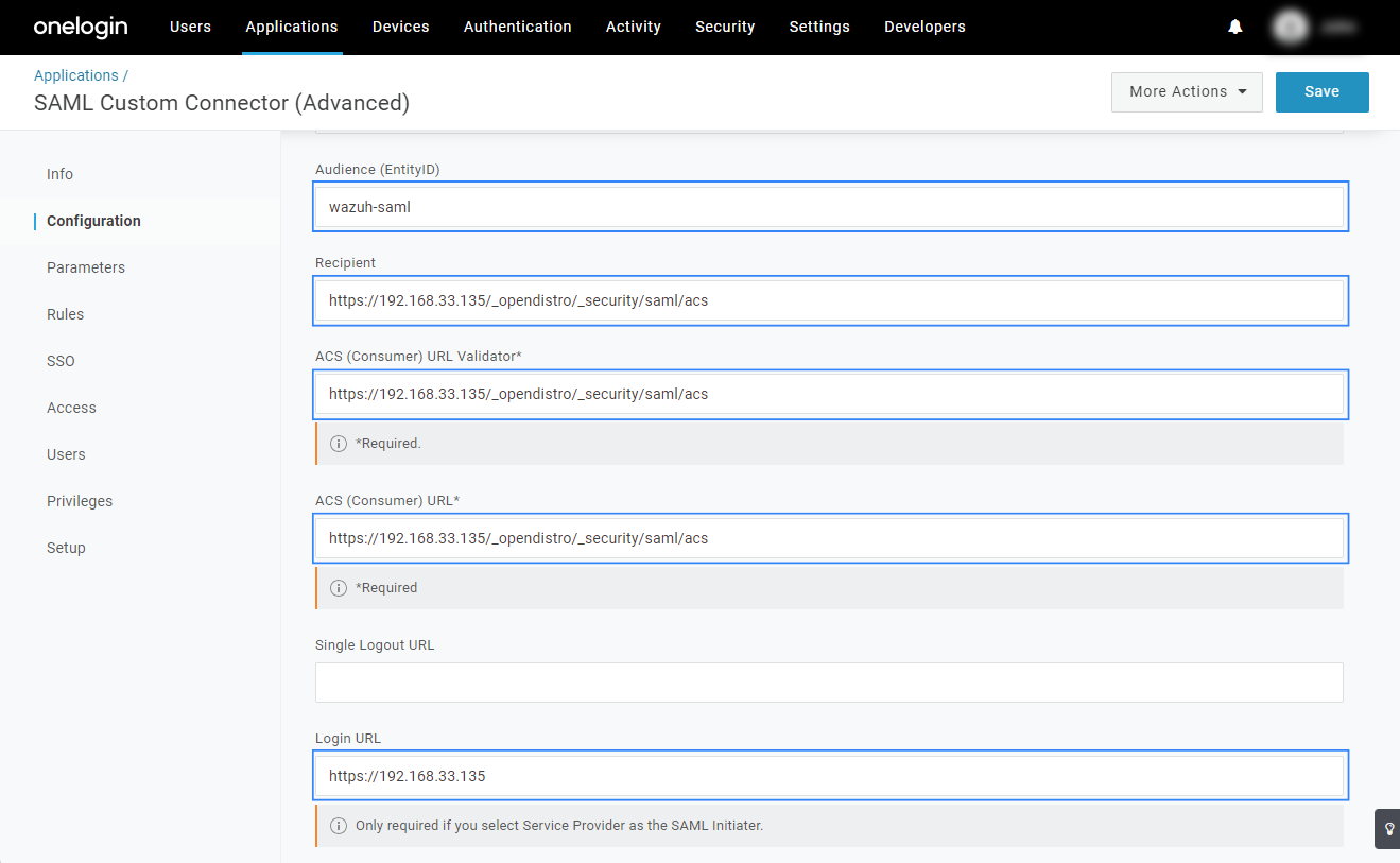 metadata_onelogin.xmlfile from the application.Go to Applications > Applications then select the Wazuh app. Click on More Actions and then select SAML Metadata.