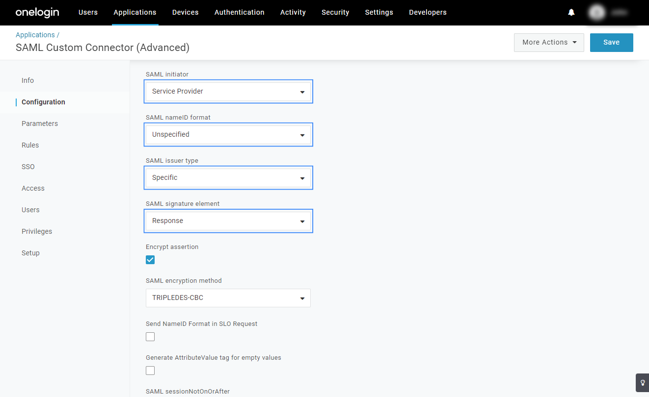 Create a new app using the SAML Custom Connector (Advanced) template and configure the SAML settings.