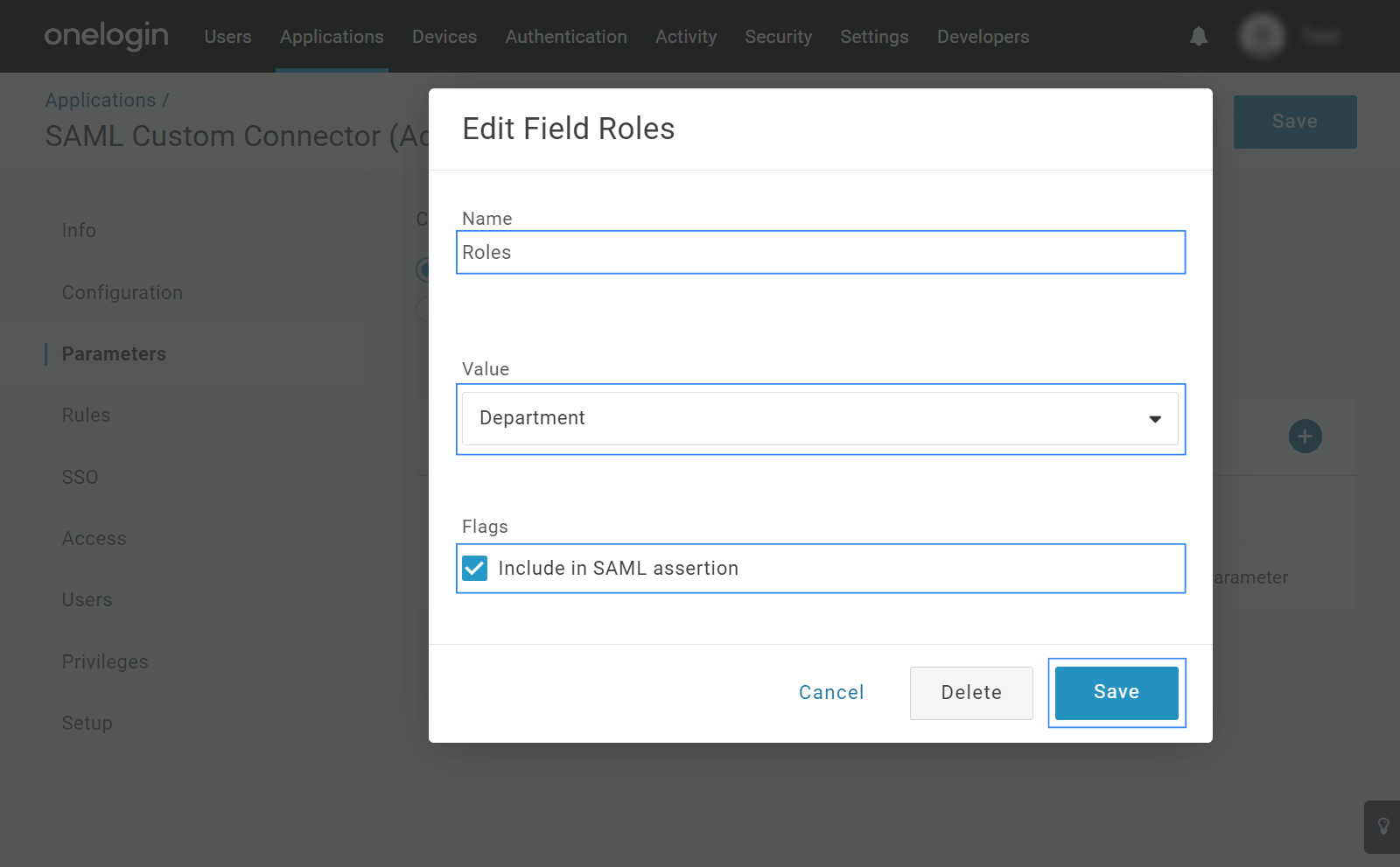 Edit the parameter details. In our case, we named the new parameter as Roles, then we selected the value Department and marked the Include in SAML assertion checkbox. The rest of the app configuration is left as default.