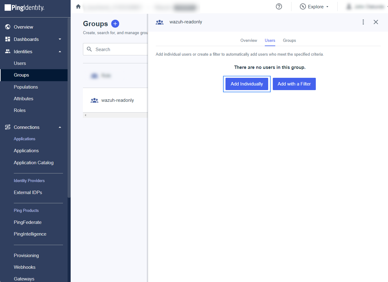 To assign users, open the created Group, go to the Users tab and select Add Individually. Add all the members that must log in to the Wazuh dashboard, and click on Save when done.